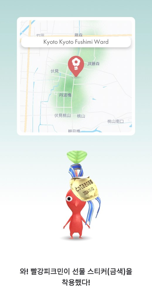 후시미 지역의 스페셜 엽서입니다. 스페셜 스폿의 엽서를 받을때부터 대열을 엉망진창으로 해놔서 그 중에 랜덤으로 피크민이 나오게 되었습니다. 그나마 2024년에 시작해 2025년까지 이어지는 이벤트에서 2024 피크민이 뜬게 나름 어울려 보이긴 합니다.
