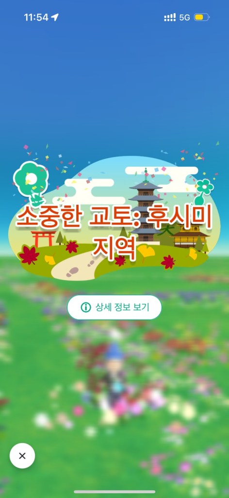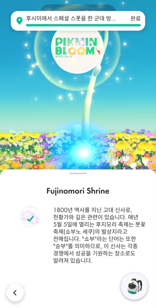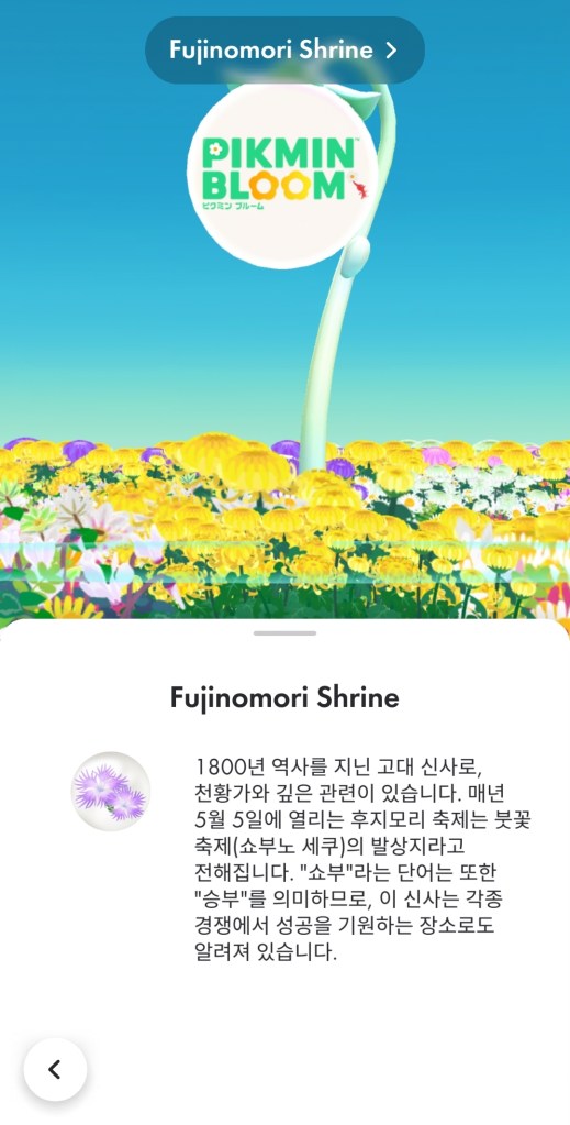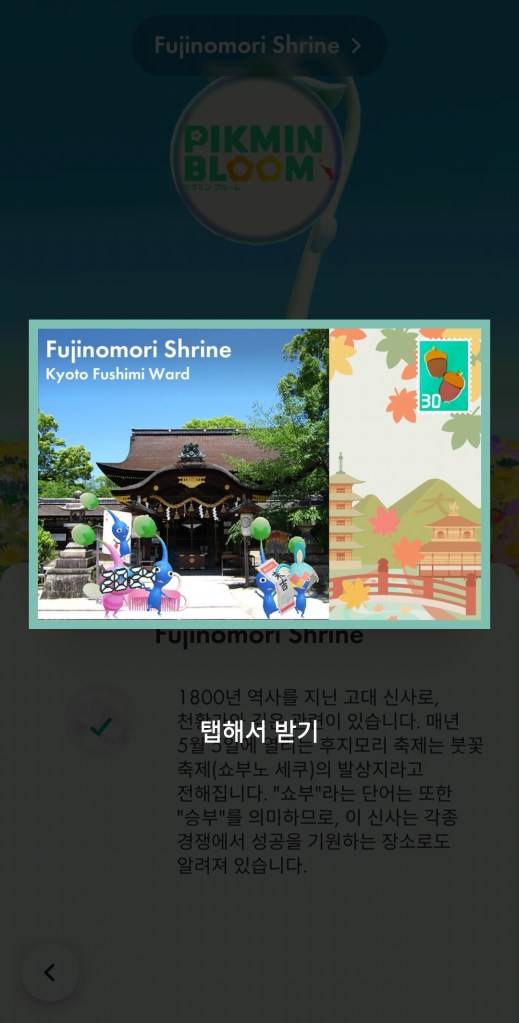 후지노모리 신사에 도착하셔서, 혹은 역에 도착하셨을 때부터 피크민 블룸을 켜보신다면 ‘소중한 교토 : 후시미 지역’ 이라는 화면이 보이며 이벤트가 시작됩니다. 저는 처음 진행하면서 막 누르다가 첫 화면을 넘겨버려서 아쉽게도 스크린샷이 없어서 커뮤니티 유저이신 LimeTea님께서 사진 제공을 해주셨습니다.
