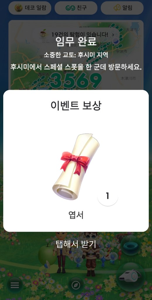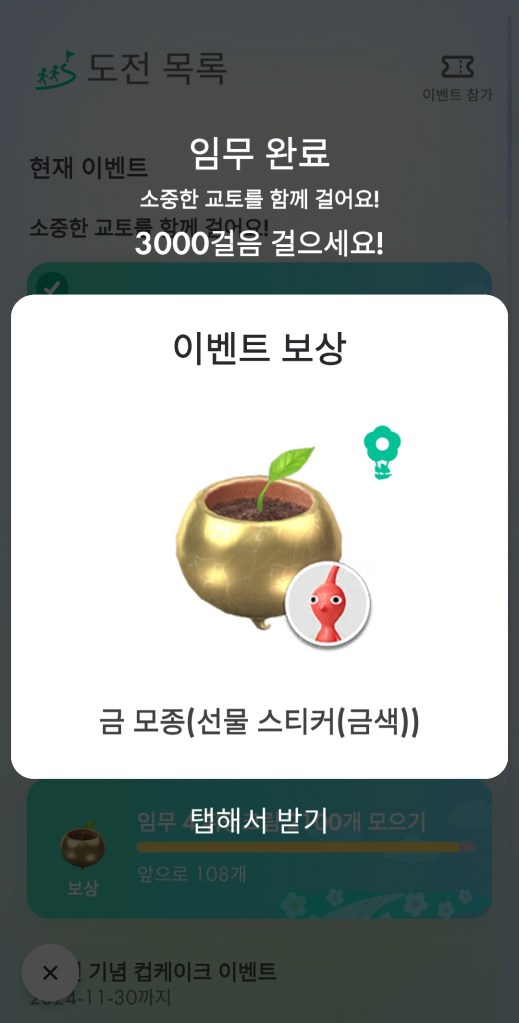 교토의 숨은 보석의 이벤트 자체가 처음이신 분이라면 소중한 교토를 함께 걸어요 라는 이벤트가 나오면서 3000 걸음을 걸으면 금 모종(선물 스티커(금색))을 받으실 수 있습니다.