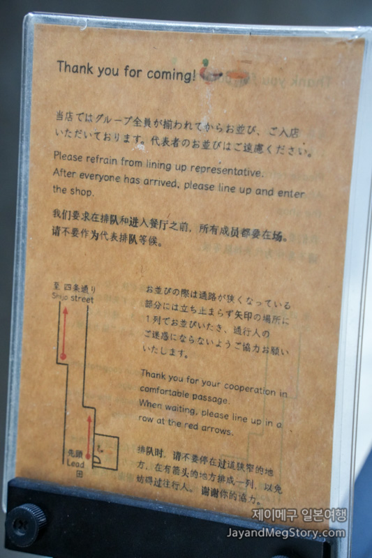 오픈 전이나, 내부가 만석일 경우 가게 정면의 왼쪽으로 줄을 서시고, 가게의 앞쪽의 줄이 막다른 길에 다다를 정도가 되면 위의 사진에 보이는 그림과 같이 조금 떨어진 곳에 줄을 서시면 됩니다. 기다리는동안 스태프분들이 몇 번씩 나와서 확인하시므로 혹시라도 잘못 서 계신다면 알맞은 대기 줄로 안내해 주실 거라 생각됩니다.