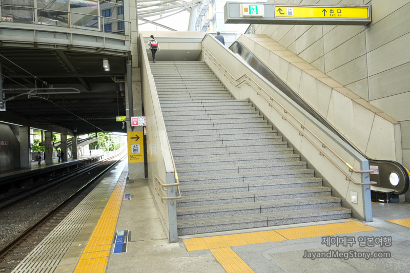 구매하신 승차권을 이용해서 JR 니시쿠조 역 안으로 들어간 후 유니버설시티역으로 가는 전철을 타는 곳인 3번 플랫폼으로 갑니다. 엘리베이터를 이용하실 분은 계단 왼쪽에 통로가 있는데, 통로 내의 엘리베이터를 이용하시면 됩니다.