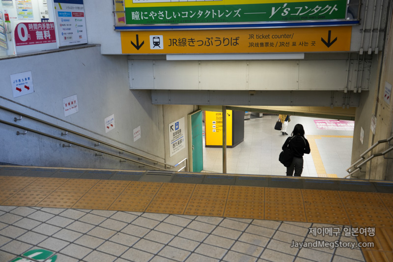 한신 전철의 니시쿠조 역 개찰구에서 나와 계단으로 내려가면 바로 JR선으로 환승하는 곳이 눈앞에 보입니다. 유모차나 무거운 짐이 있는 경우에는 계단의 우측으로 가시면 엘리베이터를 이용하실 수 있고 계단과 마찬가지로 바로 환승하실 수 있는 곳이 보입니다.