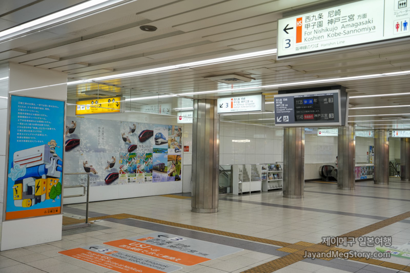 3번 플랫폼은 아마가사키 역 방면 그리고 고베산노미야 역 방면의 전철을 이용하실 수 있습니다. 참고로 난바에서 고베로 가시는 계획도 있으시다면 빨간색으로 표시된 급행 고베산노미야 편을 이용하시면 가실 수 있습니다. 3번 플랫폼에서 탑승하시는 전철은 급행과 일반 편 상관없이 모두 니시쿠조에서 정차합니다.