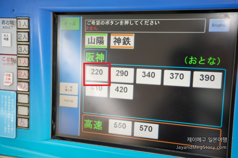 오사카 난바 역에서 한신선의 승차권 발매기는 신형과 구형이 있습니다. 사람들이 오사카 난바에서 유니버셜 시티까지 가기 위한 환승역인 니시쿠조(西九条)역까지 얼마인지 많이 찾아보고, 물어봐서인지 발매기의 상단에 니시쿠조역까지의 운임을 표시해두었습니다. 글 작성 시점 기준으로 승차권 운임은 어른은 220엔, 아이는 110엔이며, 아이는 만 6세 이상부터, 만 12세(초등학생)까지입니다.