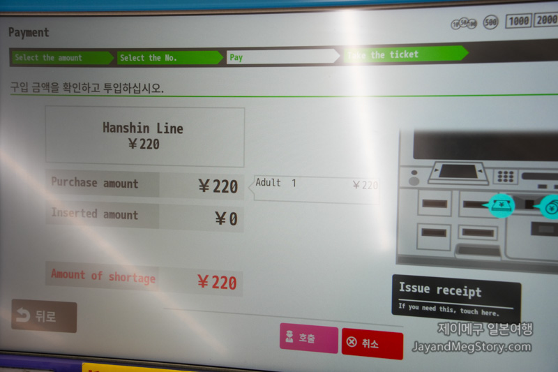 다음 화면에 바로 금액을 지불하는 화면이 나오는데, 화면의 왼쪽에 있는 어른, 아이 인수 버튼을 눌러주시면 지불해야할 금액이 변경되어 표시됩니다. 승차권을 잘 구입하셨다면 오사카 난바 역에서 유니버셜 스튜디오 재팬에 가기까지의 절반은 끝난겁니다.