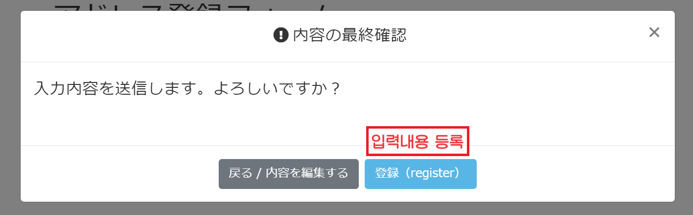 등록버튼을 누르면 입력내용을 그래도 전송해도 괜찮은지 최종 확인 메세지가 나옵니다. 파란색으로 된 등록 버튼을 눌러줍니다.