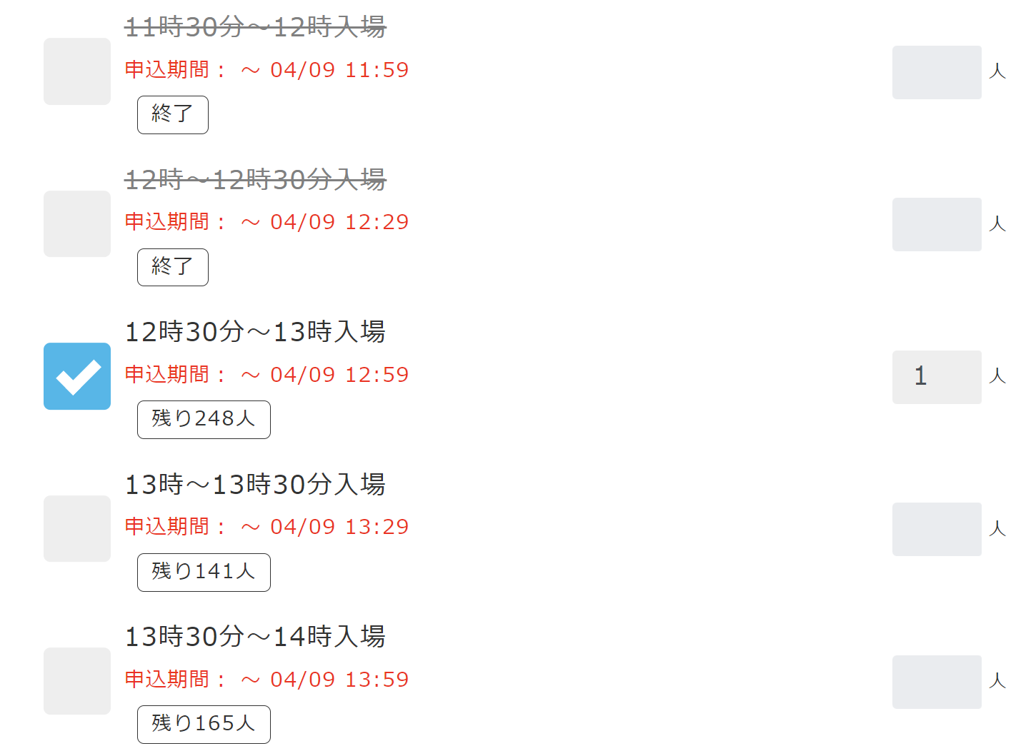 파란색으로 된 날을 누르셨다면 매 30분으로 된 여러 시간대와 잔여수가 보이게 됩니다. 시간대에 줄이 그어져있고, 종료라고 적혀있는건 선택하실 수 없습니다. 잔여수가 보이는 시간대를 클릭하시고 인원을 선택하시면 되는데, 최대 5명까지 예약이 가능합니다.