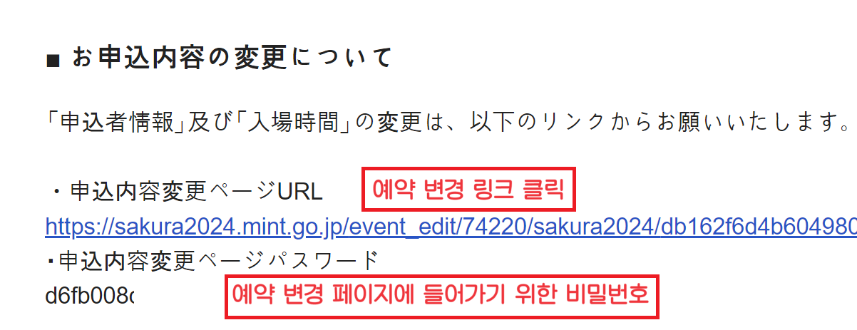 입장 QR코드 아래에 내용 변경 관련하여 써져있는 곳이 있는데, 이메일에 있는 예약 변경 링크를 눌러줍니다. 예약변경의 위에는 취소에 관련한 링크가 있기에 위의 사진과 제목이 똑같이 적혀있는지 다시한번 확인해주도록 합니다. 링크를 누르면 비밀번호를 입력해야하는데, 비밀번호는 이메일에서 예약변경 링크 아래쪽에 적혀있으니 복사하여 붙여놓으면 쉽게 입력하실 수 있습니다.