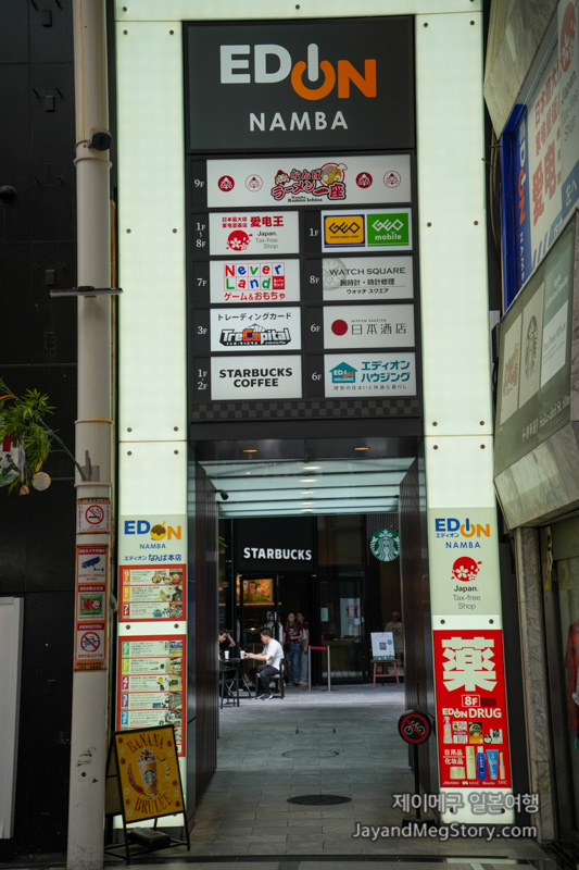 요도바시카메라, 빅카메라는 아실 테지만 에디온은 잘 모르시는 분들도 계실 거라 생각되는데, 에디온도 앞의 두 전자기기 전문 판매점과 마찬가지로 전국에 여러 체인점을 두고 있는 유명한 곳이며, 여행자센터에 가신 김에 총 9층으로 되어 있는 에디온 난바 본점 구경하시는 것도 추천드립니다. 개인적으로 제일 좋아하는 곳은 9층의 여러 가지 라멘 가게가 모여있는 난바라멘이치자(なんばラーメン一座), 7층의 아이들의 장난감과 게임이 몰려있는 네버랜드(Neverland), 그리고 4층 미용 코너도 자주 가보곤 합니다.