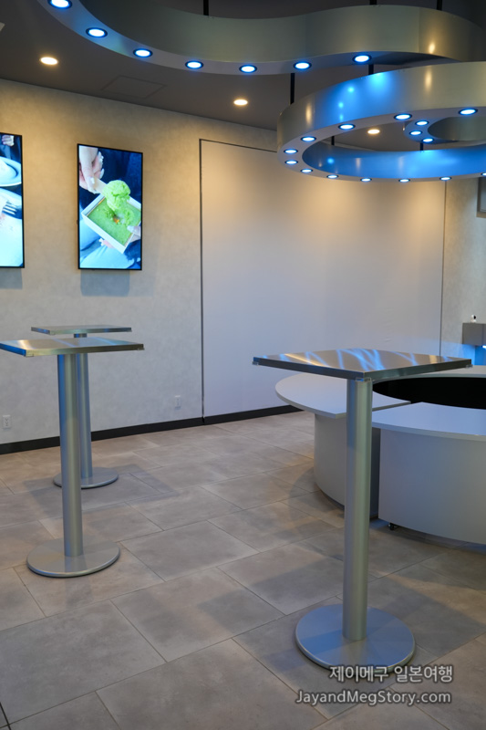 중앙에는 안내 데스크처럼 테이블이 있었고, 주변으로는 스탠딩 테이블이 있었습니다. 중앙의 테이블에서는 아직 가오픈이라 아무것도 없지만, 추후 팝업스토어나 이벤트 시 사용된다고 하고, 뒤로 보이는 흰 사각형의 공간은 스크린으로 추후 영상이 나올 예정이라고 합니다.