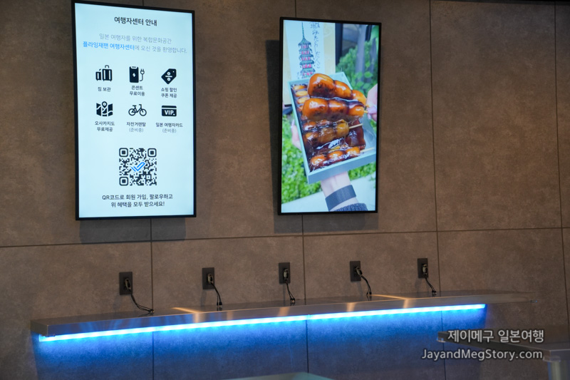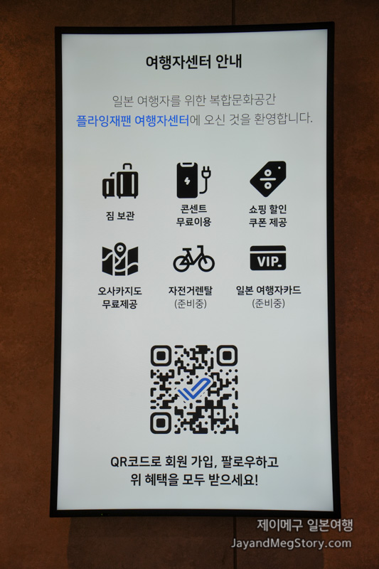 플라잉재팬 여행자센터를 방문하시면 짐 보관, 콘센트 무료 이용, 휴대폰 충전이 가능한 것 이외에도 여러 가지 특전이 있습니다. 방문 시점 기준으로는 오픈 전이라 자전거 렌털이나 일본 여행자카드 등 준비 중인 것도 있지만, 쇼핑 할인 쿠폰도 제공받을 수 있으며, 구글 지도와 연동하여 오사카의 유명 명소들을 별도 표기, 저장해 놓은 지도를 제공받으실 수 있습니다.