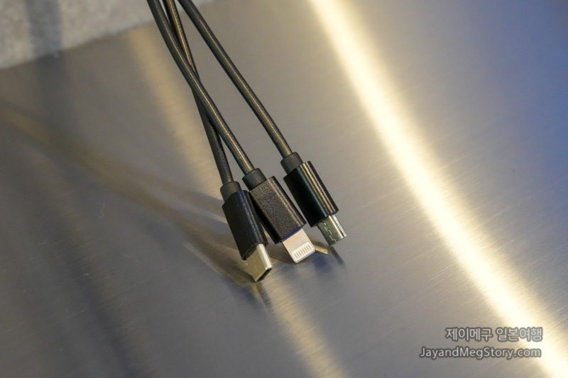 각 코드마다 마이크로 USB, 라이트닝, USB-C 타입의 충전단자로 되어 있어서 따로 선을 가지고 계시지 않아고, 가방에서 꺼내지 않아도 바로 충전할 수 있었습니다.