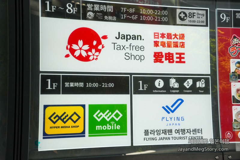 에디온 난바 본점의 입구로 가까이 가면 각 층별 정보가 보이고, 1층에 플라잉재팬 여행자센터가 있다는 것을 확인하실 수 있습니다.