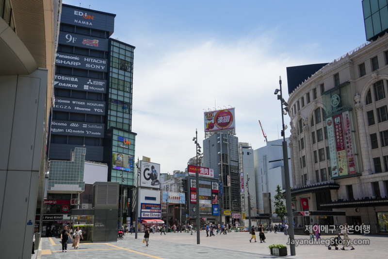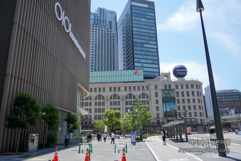 밖으로 나가면 OIOI라고 쓰여있는 마루이가 크게 보이고 오른쪽 건물은 전자제품을 판매하는 EDION, 에디온 남바 본점이 있는데, 플라잉재팬 여행자센터는 이 건물에 위치해 있습니다. 난카이 난바 역 건물에서 에디온까지의 건물 거리는 도보로 1분 정도라서 정말 가깝게 느껴집니다.
