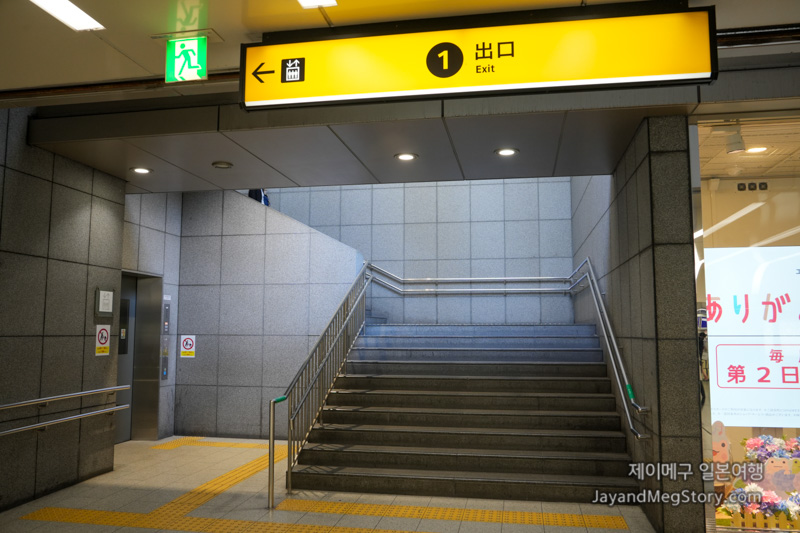 1번 출구는 위의 사진처럼 알기 쉽게 되어있지만 혹시 못 찾는 경우에는 지하의 OIOI, 마루이 입구의 왼편에 위치해 있으므로 1번 출구나 마루이를 함께 찾으시면 좀 더 찾기가 쉽지 않을까 생각됩니다.