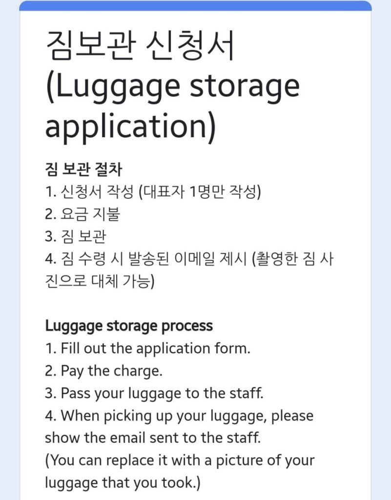 QR코드로 짐 보관 신청서를 열면 위와 같은 화면이 나오고, 짐 보관에 필요한 이름, 연락처 등 6가지 정도의 정보를 입력 후 제출하신 다음, 요금을 지불하시면 완료입니다.