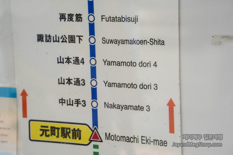 버스를 타고 몇 분 지나지 않아 야마모토도리욘초메에 도착합니다. 사실은 핸드폰을 보다가 한 정거장 더 가는 바람에 스와야마코엔시타에서 내렸는데, 한 정거장 걸어서 여기까지 왔습니다. 그만큼 금방 도착하니 이 글을 읽으시는 분들은 3 정거장을 꼭 잘 확인하시기 바랍니다.