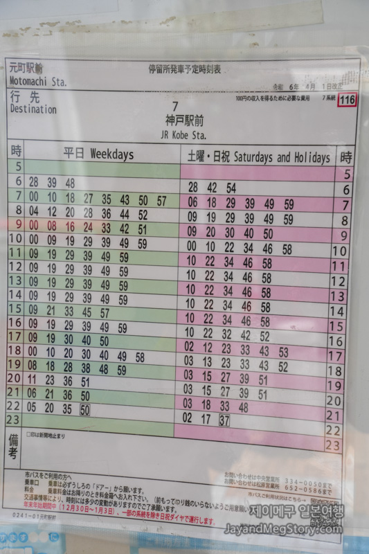 앞으로 1분 정도 가시면 모토마치역앞인 모토마치에키마에(元町駅前) 버스정류장이 보입니다. 이곳에서 고베 역 앞, 코베에키마에(神戸駅前)행 7번 버스를 타고 가시면 됩니다.