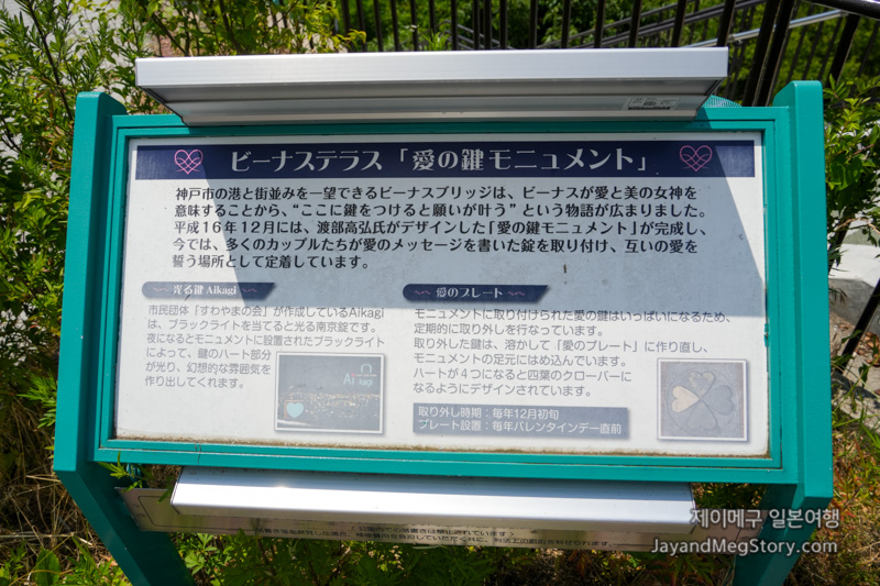 이전엔 연인들이 비너스 브릿지에 자물쇠를 걸었고, 자물쇠가 급증하면서 나온 아이디어가 이 아이노카기모뉴먼트라고 합니다. 아이노카기모뉴먼트는 디자인 공모전을 통해 결정되었으며, 2004년 12월 9일에 설치되었다고 합니다. 2004년부터 매년 12월에는 1년간 걸려있던 자물쇠를 모아서 녹여 해당 연도의 기념 플레이트로 제작되게 됩니다. 그리고 그 플레이트는 돌아오는 밸런타인데이 직전에 부착된다고 합니다.