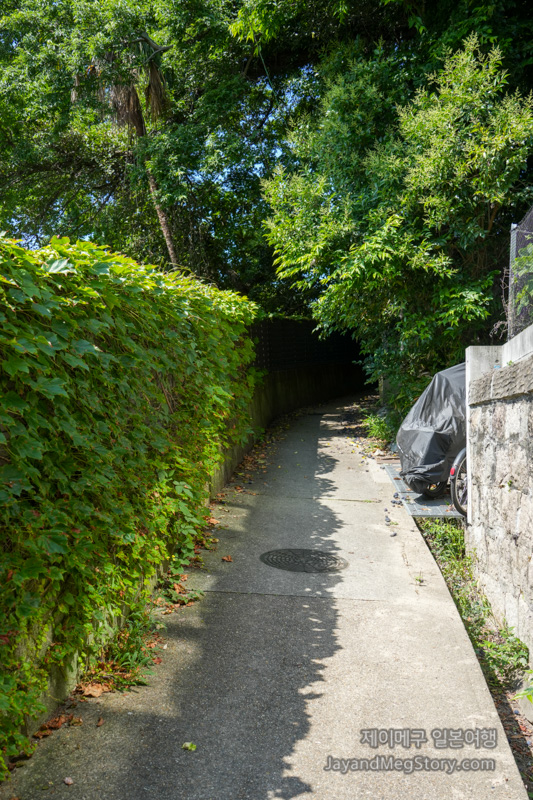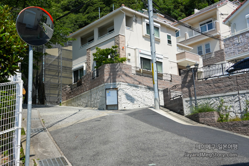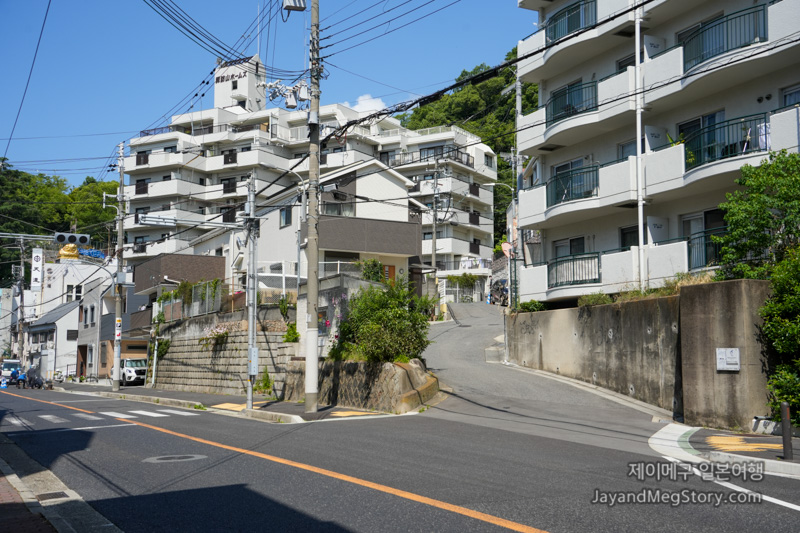 야마모토도리욘초메 정류장에서 내렸을 시에 보이는 정면 사진입니다. 왼쪽에 보이는 횡단보도를 건너 오르막길을 올라가도록 합니다.
